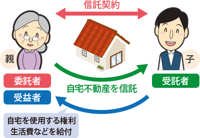- 親が認知症などによって判断能力が衰える前に、自宅を信託財産として、信託契約をお子さんと締結する。